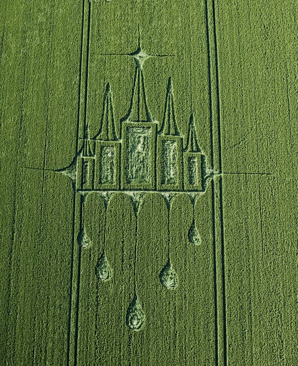 We have a pattern of 5 throughout starting with the tears hanging on a foundation being pulled down at five points like a curtain. Five is the number for mercy, and this is a show of mercy. On the right and left the same lines, but we know tears only fall. We have 12 plus the five squares for 17. The spires add to ten (27) the star of Bethlehem for one.