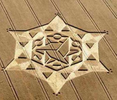 The image of the new Jerusalem in crop fields of England each gate is framed by an inverted pyramid/triangle shape winged angels standing guard behind them comprised of two raised sections for twelve. The star of David in the Center has ten raised areas. We are at 34 raised sections. There are 18 dotted circles again outside a star...